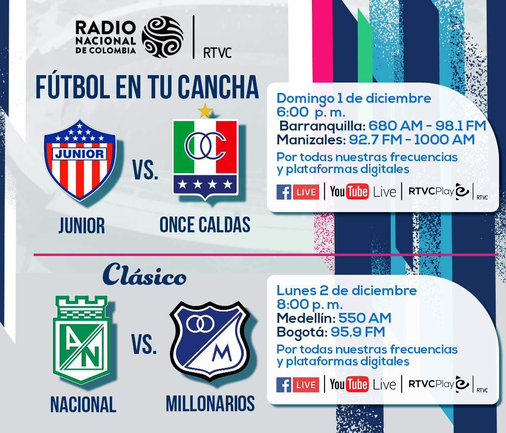 Enviado por afcastellanos@c... el Vie, 11/29/2024 - 16:14 Imagen: Enlace: Nacional vs Millonarios y Junior vs Once Caldas, en vivo por Radio NacionalCategoría: noticias