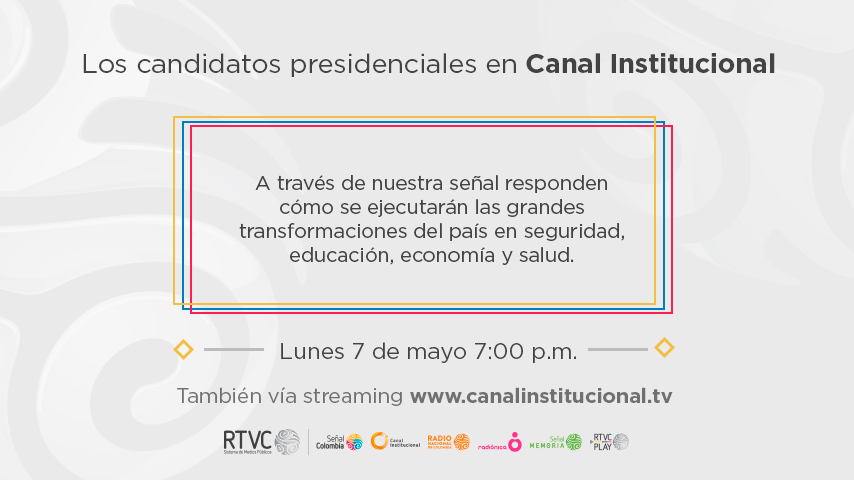 No se pierda este debate con el sello de RTVC Sistema de Medios Públicos, que será transmitido en vivo y se podrá ver también vía streaming en http://www.canalinstitucional.tv/