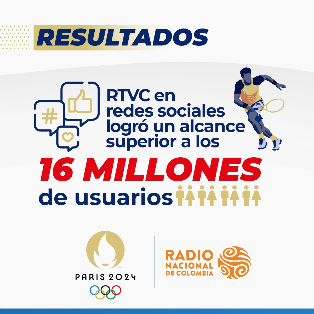 Los contenidos difundidos en las redes sociales de RTVC, lograron llegar a cerca de 16 millones de usuarios, quienes vivieron y siguieron el cubrimiento minuto a minuto de los Juegos Olímpicos desde París, a través de sus dispositivos móviles, cumpliendo la función social de informar a todos los colombianos a través del Sistema de Medios Públicos.