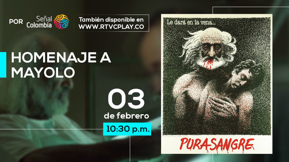 El martes 3 de febrero, a las 10:30 p. m., Señal Colombia transmitirá la película Pura sangre, protagonizada por Carlos Mayolo, en el marco de la conmemoración de los 19 años de su fallecimiento. Obra fundamental para comprender el cine de terror colombiano, en la que se propone una reinterpretación del vampirismo desde una mirada urbana y realista, alejada de lo sobrenatural.