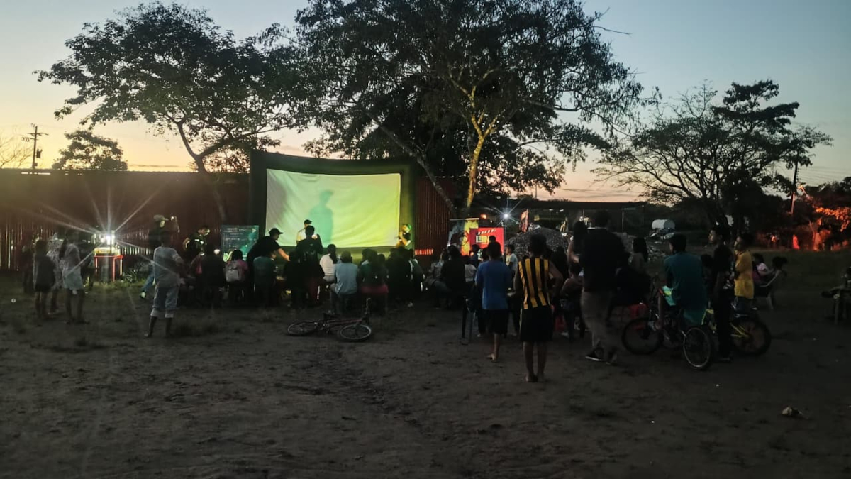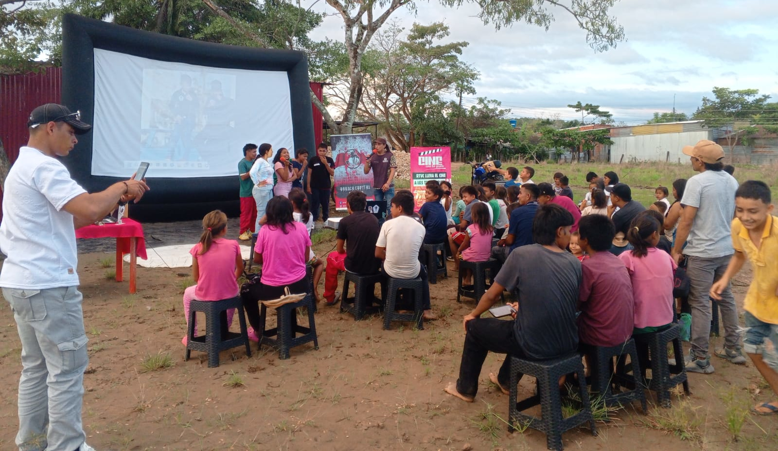 Desde temprano, el equipo de RTVC dispuso todo para instalar la pantalla gigante de cine en el asentamiento y alistar cada detalle para que la gente pasara un rato fantástico con su comunidad.