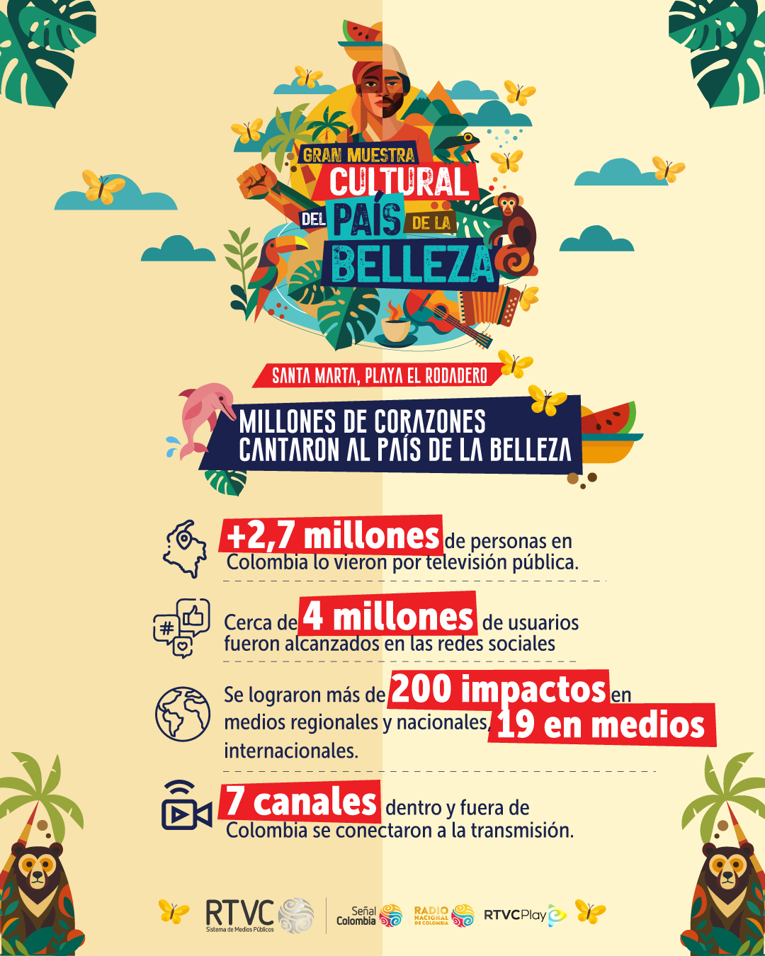 Con más de nueve horas de transmisión en directo desde Santa Marta y para todo el país, la Gran Muestra Cultural del País de la Belleza se consolidó como uno de los eventos culturales más vistos del año en la televisión pública colombiana, dejando excelentes resultados.