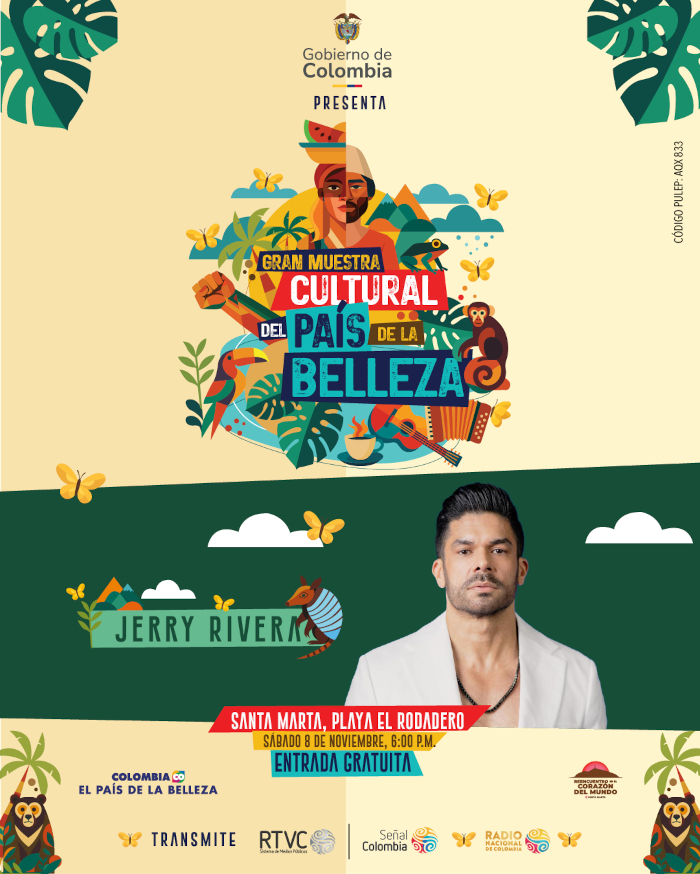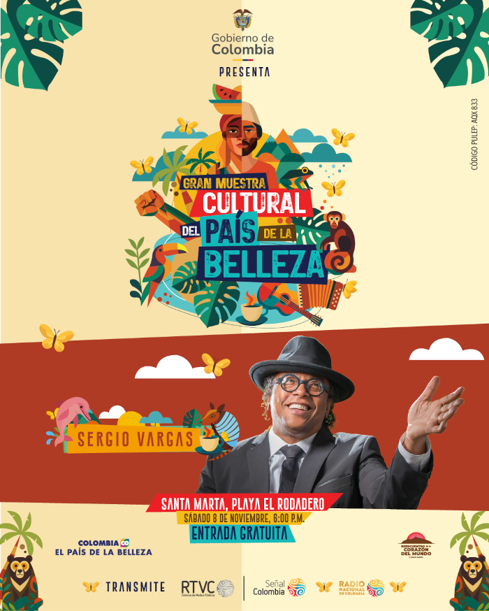 El próximo sábado 8 de noviembre, El Rodadero, en Santa Marta, será el escenario de la Gran Muestra Cultural del País de la Belleza, un evento gratuito y multitudinario que celebrará la identidad latinoamericana y caribeña. Organizado por el Ministerio de Comercio, Industria y Turismo, a través de Fontur y en alianza con RTVC, este encuentro será transmitido por Señal Colombia (https://www.senalcolombia.tv/ ) y Radio Nacional de Colombia (https://www.radionacional.co/en-vivo/en-vivo-radio-nacional-de-colombia ), llevando al mundo la riqueza cultural del país y la integración entre continentes.